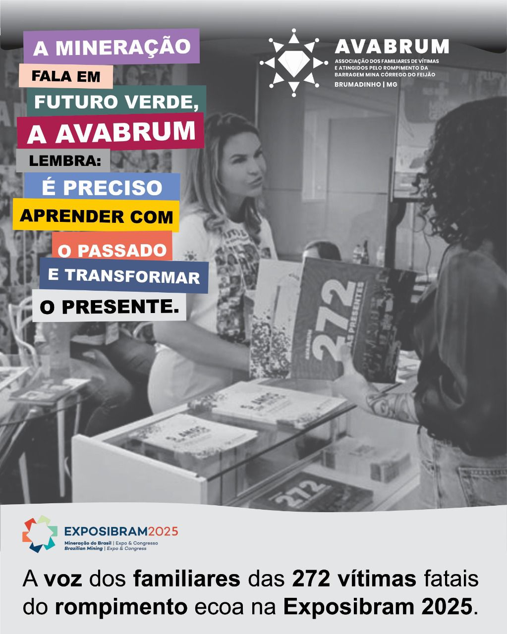 A AVABRUM estará presente na EXPOSIBRAM 2025, o maior evento de mineração da América Latina, para garantir que o CUSTO DAS 272 VIDAS PERDIDAS em Brumadinho não seja soterrado pelo marketing do “Futuro Verde”. Não há mineração responsável sem reparação justa e sem novos padrões de segurança. Levaremos nossa denúncia