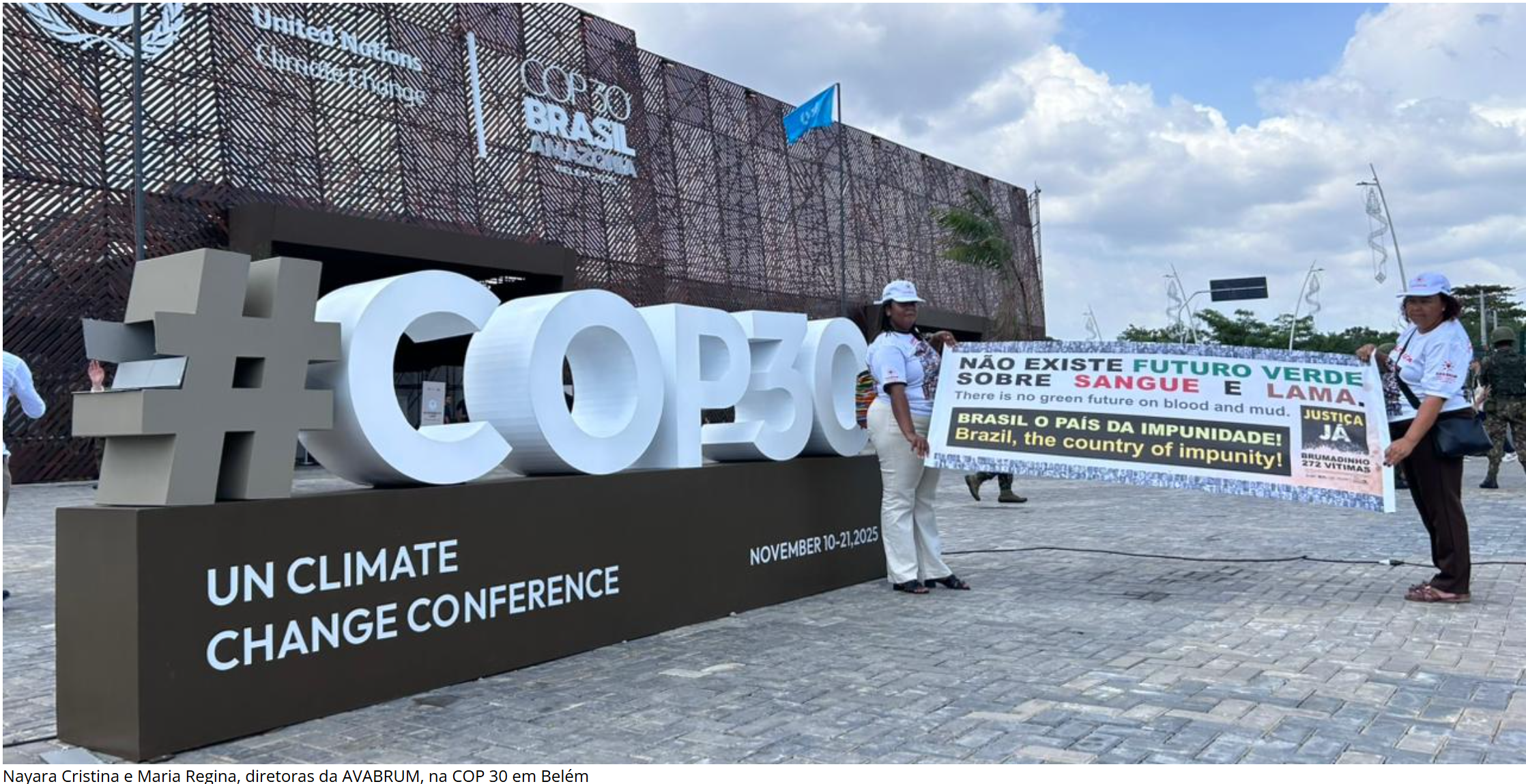 A participação da AVABRUM na COP30 colocou, novamente, em evidência a luta das famílias atingidas pelo rompimento da barragem da Vale, em Brumadinho. As diretoras Nayara Porto e Maria Regina da Silva representaram a Associação na conferência realizada em Belém, onde ampliaram a visibilidade da causa, estabeleceram novas alianças e reforçaram o alerta sobre os impactos da mineração sem limites.